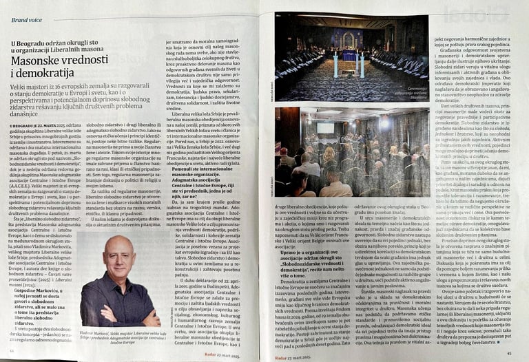 In its issue of March 27, 2025, the Belgrade weekly RADAR published an interview with the Grand Master of the Liberal Grand Lodge of Serbia, Vladimir Marković, on the occasion of the International Masonic Conference held in Belgrade on March 21 in the presence of Grand Masters from 16 European countries.