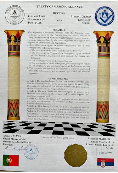 Dana 26. juna 2022. godine u Or. Lisabon, tokom godišnje skupštine Simboličke Velike Lože Portugala, potpisan je Ugovor o masonskom savezu između Simboličke Velike Lože Portugala i Liberalne Velike Lože Srbije.U ime SVLP-a Ugovor je potpisao Veliki Majstor N:.U:. Brat Amadeu Alves, a za Liberalnu Veliku Ložu Srbije potpisnik je bio Veliki Majstor N:.U:. brat Vladimir Marković.